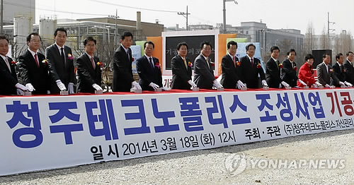 | △ 청주테크노폴리스 산업단지 조성 '첫 삽' (청주=연합뉴스) 박재천 기자 = 18일 청주시 흥덕구 외북동에서 청주테크노폴리스 산업단지 조성 사업 기공식이 열리고 있다. 이 사업은 152만7천575㎡를 도심형 첨단복합산업단지로 개발하는 것이다. 2014.3.18 <<청주시 제공>> jcpark@yna.co.kr |