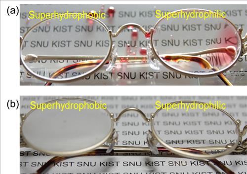 | △ 나노돌기 유리로 제작한 초발수.초친수 안경렌즈. 안경을 냉장고에 넣었다가 꺼낸 모습(b) 초발수성(superhydrophobic) 렌즈에는 미세한 물방울이 맺쳐 김이 서렸지만 초친수성(superhydrophilic) 렌즈에는 김서림이 없다. |