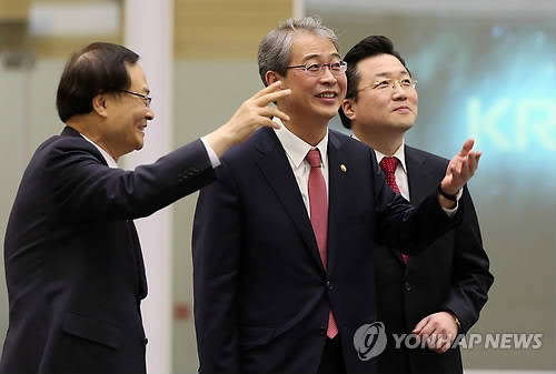 | △ 임종룡 금융위원장, 한국거래소 방문 (서울=연합뉴스) 신준희 기자 = 임종룡 신임 금융위원장(가운데)이 19일 오후 서울 여의도 한국거래소를 방문, 최경수 이사장으로부터 설명을 듣고 있다. 오른쪽은 이현철 금융위 자본시장국장. |
