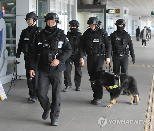 | △ 폭발물 설치 협박에 특공대 수색중 (부산=연합뉴스) 차근호 기자 = 19일 오전 9시11분께 대한항공 온라인 발권 채팅사이트로 김해공항에 폭발물을 설치했다는 협박 글이 남겨져 공항 특공대와 경찰이 폭발물 수색작업을 벌이고 있다. ready@yna.co.kr |