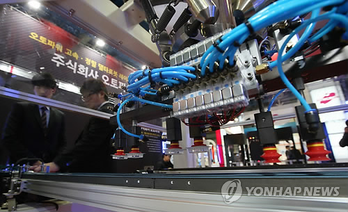 | △ 지난 18일 오전 서울 강남구 코엑스에서 열린 국제 스마트 공장 자동화 산업 대전 '오토메이션 월드(Automation World) 2015'에서 업체 관계자가 델타로봇을 이용해 부품 옮기기 시연을 하고 있다. |