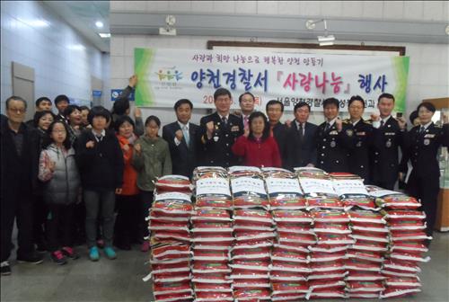 경찰은 전날 모범 청소년, 가정폭력 피해자, 북한이탈 주민, 다문화 가정 등 사회적 약자 155가구에 사단법인 청소년육성회 양천지구회 후원으로 마련한 쌀 300포대(3천㎏)와 이불 5채를 전달했다.