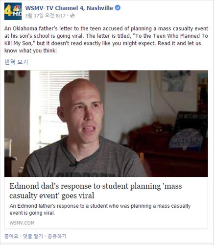 (댈러스=연합뉴스) 장현구 특파원 = 자신의 아들을 포함해 한 고등학교에 다니던 학생들을 대상으로 대량 살상을 기도하던 범죄 용의자에게 용서의 편지를 보낸 한 미국 아버지의 사연이 잔잔한 감동을 던졌다.