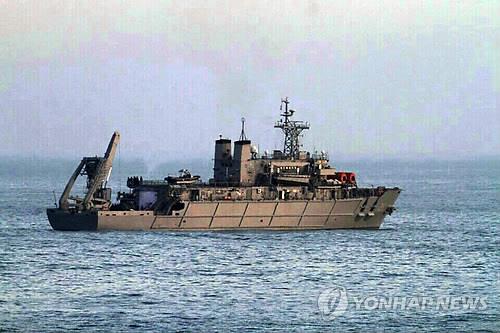 | △ 가거도 추락 헬기 인양 준비하는 청해진함 (신안=연합뉴스) 장아름 기자 = 지난 13일 전남 신안군 흑산면 가거도 해상에서 추락한 해경 구급헬기의 동체가 19일 낮 발견됐다. 서해해양경비안전본부는 유실 방지망을 설치하고 동체를 통째로 인양한 뒤 실종자 수색을 할 계획이다. 사진은 이날 오후 7시 50분께 사고 해역에서 인양 준비작업에 투입 중인 청해진함의 모습. (독자제공) |