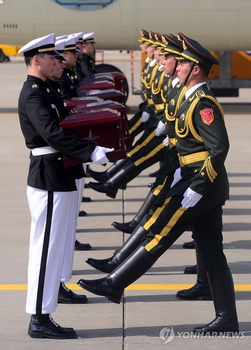 | △ 중국군 유해 인도식 (영종도=연합뉴스) 신준희 기자 = 20일 오전 영종도 인천공항에서 열린 중국군 유해 인도식에서 한국 군(왼쪽)이 중국 군에 유해를 인도하고 있다. 한중 양국은 지난 2014년 3월 중국군 유해 437구를 처음으로 중국측에 송환하였으며, 이후 지난 1년동안 발굴된 중국군 유해 68구를 이날 송환했다. 2015.3.20 hama@yna.co.kr |
