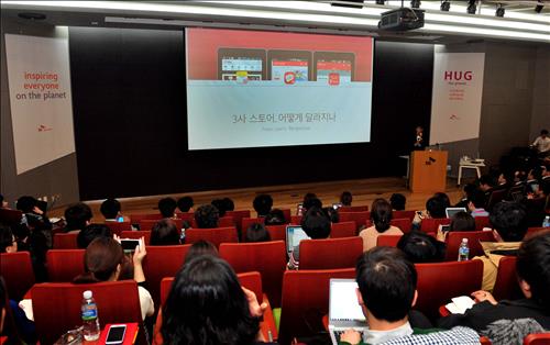 (분당=연합뉴스) 김은경 기자 = KT[030200], SK플래닛, LG유플러스[032640] 등 이동통신 3사 앱마켓 사업자는 모바일 앱마켓(올레마켓·T스토어·U+스토어) 인프라를 하나로 묶는 '원스토어 프로젝트'에 대한 개발자 설명회를 20일 오후 개최했다