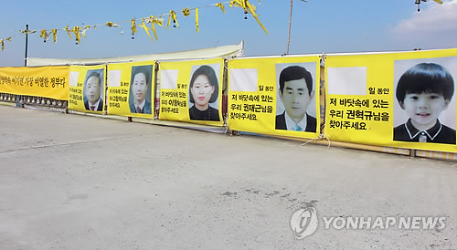 | △ '가족의 품으로 돌아갈 수 있도록' (진도=연합뉴스) 장아름 기자 = 304명의 희생자를 낸 세월호 참사가 발생한 지 1년이 되가지만 아직 9명의 실종자가 가족의 품으로 돌아가지 못하고 있다. 진도 팽목항에는 남은 실종자들이 하루빨리 가족의 품으로 돌아가길 기원하며 실종자들의 이름과 얼굴이 담긴 플래카드가 곳곳에 휘날리고 있다. (연합뉴스 자료사진) |
