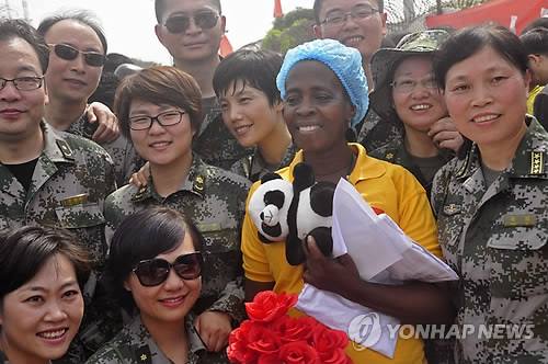 | △ (AP=연합뉴스) 지난 5일(현지시간) 라이베리아에서 에볼라 환자였던 베아트리스 야르돌로가 치료를 마친 뒤 퇴원하면서 중국 의료지원단과 기념촬영을 하는 모습. |
