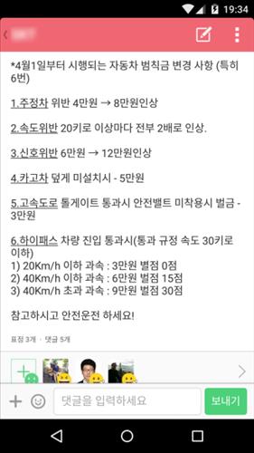 '4월1일부터 시행되는 자동차 범칙금 변경사항'이란 제목으로 ▲주정차 위반 ▲ 속도위반 ▲ 신호위반 ▲ 카고차 덮개 미설치 시 ▲ 고속도로 톨게이트 통과 시 안전벨트 미착용 ▲ 하이패스 차량 진입 통과 시 등 6가지 항목으로 구성됐다.