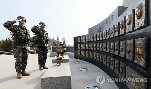 정부가 천안함 피격 1주년을 맞아 2011년에 세운 이 위령탑에는 지금도 군 장병들과 국민의 발길이 끊이지 않고 있다.