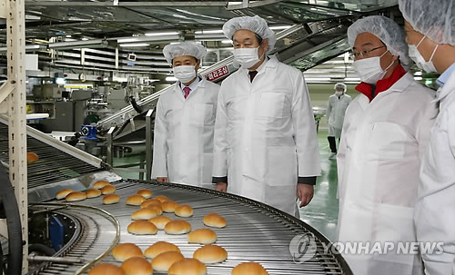 | △ 새누리당 김무성 대표가 현장행보를 강화하고 있다. 사진은 김 대표가 지난 19일 경기도 성남에 있는 샤니 공장을 찾아가 빵 생산과정을 둘러보고 있는 모습. |