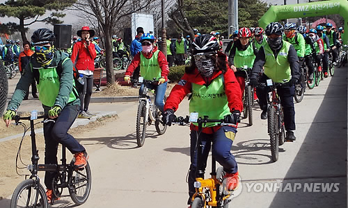 (파주=연합뉴스) 김도윤 기자 = 경기도와 경기관광공사는 22일 파주시 민간인출입통제선 일대에서 올해 첫 'DMZ(비무장지대) 자전거투어' 행사를 열었다.