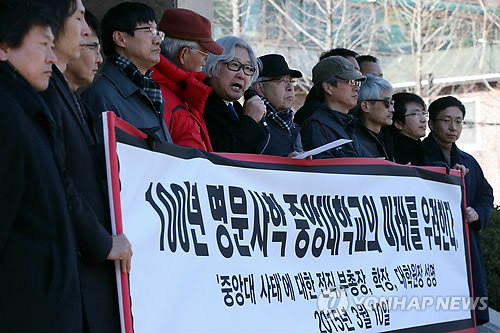 | △ 중앙대학교 전직 부총장, 대학원장, 단과대학장 등이 지난 10일 서울 동작구 중앙대학교에서 2016학년도 학과제 전면 폐지를 골자로 한 중앙대 학사구조 개편안에 대한 입장을 담은 성명을 발표하고 있다. |