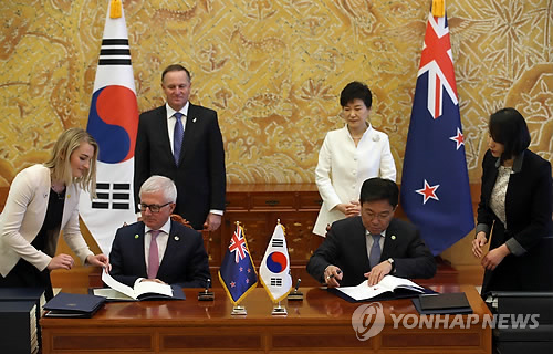 | △ 한·뉴질랜드 협정서명식 (서울=연합뉴스) 도광환 기자 = 박근혜 대통령과 존 키 뉴질랜드 총리가 참석한 가운데 23일 오전 청와대에서 열린 한-뉴질랜드 협정서명식에서 윤상직 산업자원부 장관과 티모시 그로서 통상장관이 양국 자유무역협정(FTA) 협정문과 부속서에 서명하고 있다. |
