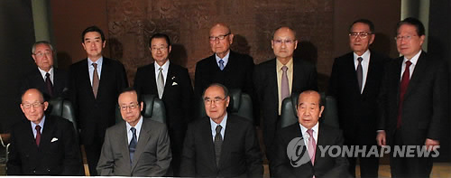 | △ 22일 오후 일본 도쿄도(東京都) 오쿠라호텔에서 열린 '한일 현인(賢人)회의'에 참석자들이 기념 촬영을 하고 있다. 앞줄 오른쪽부터 김수한 전 한국 국회의장, 이홍구 전 국무총리, 후쿠다 야스오(福田康夫) 전 일본 총리. |