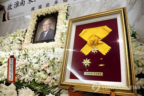 | △ '한국경제 개척자' 송인상 고문 별세 (서울=연합뉴스) 김수진 기자 = 재무부 장관과 초대 한국수출입은행장을 지낸 송인상 효성그룹 고문이 별세한 23일 서울 연세대 세브란스병원에 마련된 고인의 빈소에 경제 발전에 이바지한 공로로 수상한 국민훈장 무궁화장이 놓여 있다. |