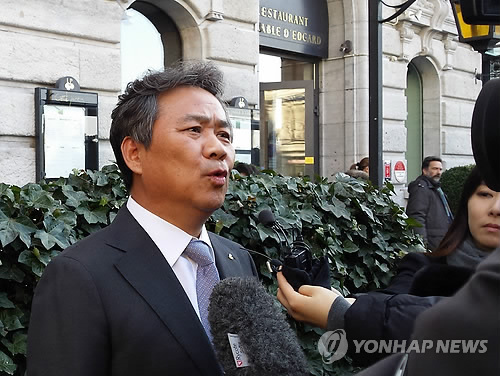 | △ 이기흥 대한수영연맹 회장이 23일(현지시간) 스위스 로잔의 팰레스호텔에서 열린 박태환의 징계 여부 및 수위를 다룰 국제수영연맹(FINA) 도핑위원회 청문회를 마친 후 취재진의 질문에 답하고 있다. 이 회장은 이날 "박태환 선수에 대한 국제수영연맹 도핑위원회의 청문회 결과가 2-3일내 발표될 것"이라고 밝혔다. |