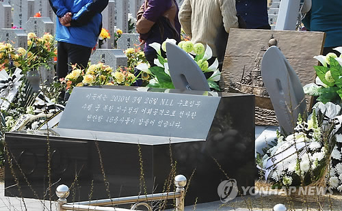 | △ 천안함 묘역 참배 (대전=연합뉴스) 이재림 기자 = 천안함 피격 사건 5주년을 나흘 앞둔 22일 대전 유성구 국립대전현충원에 '천안함 46 용사' 를 참배하려는 시민의 발길이 이어진 가운데 묘역에 추모글이 적힌 묘비가 놓여 있다. 2015.3.22 walden@yna.co.kr |