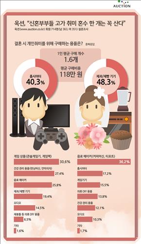 24일 온라인쇼핑사이트 옥션(www.auction.co.kr)에 따르면 18~22일 예비 부부와 결혼기간 1년 이하 신혼부부 714명(남 363명·여 351명)를 대상으로 조사한 결과 90.8%가 혼수로 1개이상의 취미생활용품을 이미 구입했거나 준비하고 있다고 답했다.