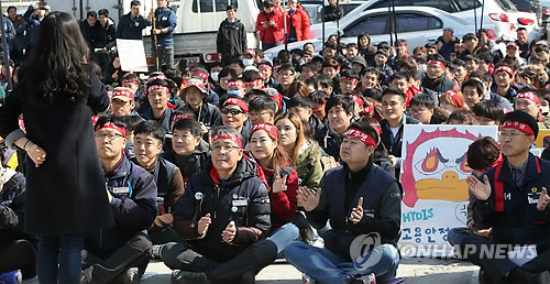 | △ 이천 하이디스 노조 '공장폐쇄·정리해고' 규탄 집회 (이천=연합뉴스) 신영근 기자 = TFT-LCD(초박막 액정표시장치) 제조업체 하이디스테크놀러지(하이디스) 노조가 24일 오후 경기도 이천시 부발읍 SK하이닉스 정문 앞에서 공장폐쇄와 정리해고 철회 등을 촉구하는 집회를 개최하고 있다. 금속노조 하이디스지회 소속 노조원들은 이날 집회에서 "하이디스를 인수한 대만기업 E-ink(이잉크)와 하이디스가 오는 31일 공장폐쇄를 결정, 331명의 노동자가 길거리로 내몰리게 됐다"면서 "해외투기자본 이잉크는 '먹튀 행각' 공장폐쇄 결정을 당장 철회하라"고 주장했다. |