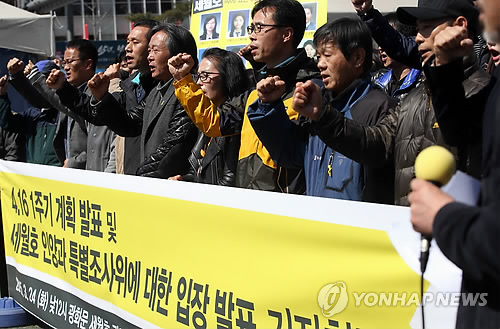 (서울=연합뉴스) 설승은 기자 = 세월호 유가족과 실종자 가족으로 구성된 4·16가족협의회와 세월호 참사 가족대책위는 24일 오후 서울 광화문광장에서 기자회견을 열어 세월호 참사 1주기 전에 세월호 선체 인양을 결정해야 한다고 촉구했다.