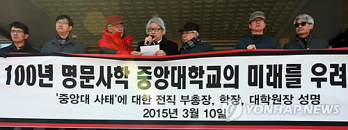 | △ '중앙대학교의 미래를 우려한다' (서울=연합뉴스) 박동주 기자 = 중앙대학교 전직 부총장, 대학원장, 단과대학장 등이 10일 서울 동작구 중앙대학교에서 2016학년도 학과제 전면 폐지를 골자로 한 중앙대 학사구조 개편안에 대한 입장을 담은 성명을 발표하고 있다. 2015.3.10 pdj6635@yna.co.kr |