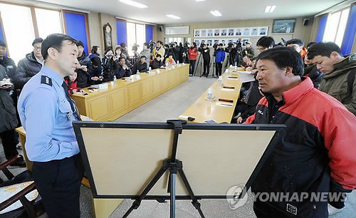 | △ 불법조업 중국어선 대책 논의하는 대청도 주민들 (인천 사진공동취재단=연합뉴스) 24일 인천시 옹진군 대청도 대청면사무소에서 열린 주민간담회에서 윤병두 인천해양경비안전서장이 불법조업 중국어선에 대한 대책을 주민들과 논의하고 있다. 2015.3.24 tomatoyoon@yna.co.kr |