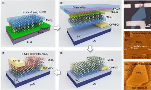 연구진은 2차원 구조 소재인 황화몰리브데넘을 반도체 소재로 활용, 3염화금(AuCl₃)과 벤젠바이올로젠(Benzyl viologen) 용액을 사용한 화학적 도핑기술을 적용해 수직형 p-n 접합 트랜지스터를 제작했다.
