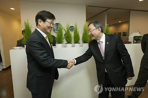 | △ 미래창조과학부-방송통신위원회 정책협력 간담회 (서울=연합뉴스) 최양희 미래창조과학부 장관(왼쪽)과 최성준 방송통신위원회 위원장이 24일 오후 경기도 의왕시의 한 식당에서 정책협력 간담회를 하기 전 인사하고 있다. 2015.3.24 << 미래창조과학부 제공 >> photo@yna.co.kr |