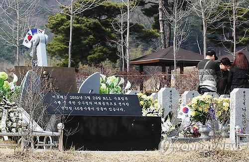 | △ 천안함 피격 사건 5주년을 나흘 앞둔 지난 22일 대전 유성구 국립대전현충원 '천안함 46 용사' 묘역에 시민들이 찾아 고인을 참배하고서 묘소 주변에서 이야기를 나누고 있다. |