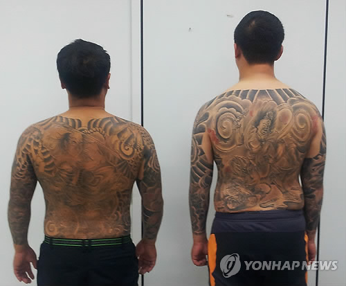 | △ 경기경찰2청 '청평식구파' 일당 검거 (의정부=연합뉴스) 경기지방경찰청 제2청 광역수사대는 경기북부지역과 강원도 화천 일대에서 활동한 폭력조직 '청평식구파'의 두목과 조직원 등 61명을 검거했다고 25일 밝혔다. 이들은 2005년께부터 외제차로 교통사고를 일으켜 보험금을 받아내고 각종 이권에 개입한 혐의를 받고 있다. 사진은 조직원의 문신. 2015.3.25 <<경기지방경찰청 제2청 제공>> andphotodo@yna.co.kr |