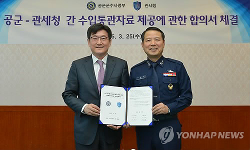 (서울=연합뉴스) 김귀근 기자 = 공군은 25일 항공기 수리부속 및 장비와 같은 수입 군수품에 대한 원가·납품가격 검증을 강화하기 위해 관세청과 '통관정보 제공에 관한 양해각서'를 체결했다고 밝혔다.
