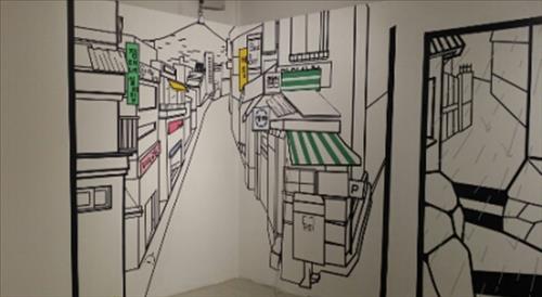 프로젝트 그룹 옆(엽)은 재미로 곳곳을 탐방하며 느꼈던 즐거운 경험을 토대로 라인 테이프를 이용해 실 속 공간 위에 이차원과 삼차원을 넘나드는 유쾌한 가상공간을 만들었다.