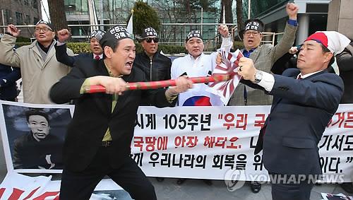 | △ 일본 규탄 퍼포먼스 (서울=연합뉴스) 한종찬 기자 = 25일 오후 시민단체 애국국민운동대연합 회원들이 서울 종로구 주한일본대사관 앞에서 집회를 열고 안중근 의사 유해 송환을 촉구하며 퍼포먼스를 하고 있다. 2015.3.25 saba@yna.co.kr |