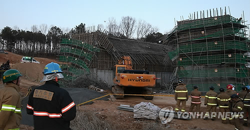| △ 용인 도로공사 공사장 붕괴사고 현장 (용인=연합뉴스) 신영근 기자 = 25일 오후 경기도 용인의 한 도로공사 현장에서 붕괴사고가 발생 소방관계자들이 혹 매몰된 작업자가 있는지 수색 작업을 벌이고 있다. |