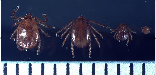 | △ SFTS를 옮기는 작은소피참진드기(왼쪽부터 암컷, 수컷, 약충, 유충). 눈금 한칸=1㎜ |