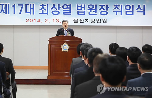 | △ 최상열 울산지방법원장은 올해 재산공개에서 140억2천830만원을 신고했다. 최 울산지방법원장이 작년 2월 13일 열린 취임식에서 취임사를 하고 있다. (연합뉴스 자료사진) |