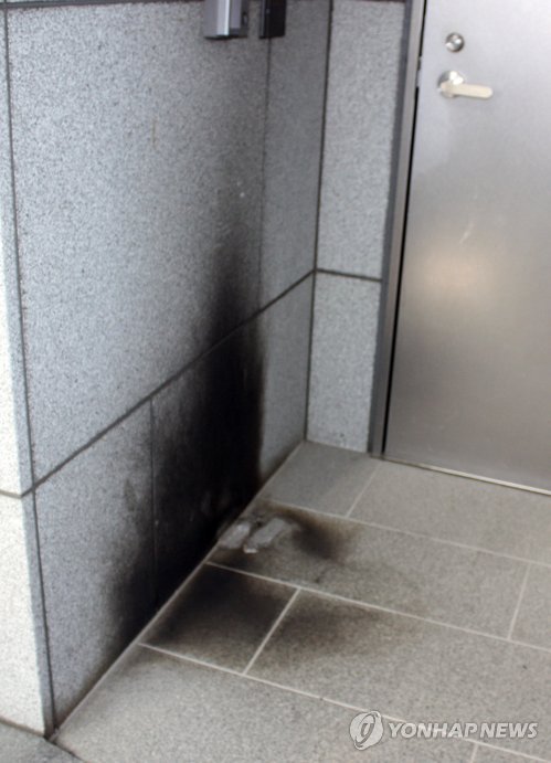 | △ 도쿄 한국문화원 상대 방화시도 (도쿄=연합뉴스) 이와이 리나 통신원 = 26일 오후 일본 도쿄도 신주쿠(新宿)구 소재 한국문화원(코리아센터)의 보조 출입구 인근 외벽에 그을음이 남아 있다. 한국문화원 관계자에 따르면 전날 오후 11시 50분께 신원을 알 수 없는 인물이 이곳에 라이터용 기름을 붓고 방화를 시도했다. 이 건물에 입주한 한국관광공사 직원이 직후인 오후 11시 55분께 퇴근하면서 그을음을 확인하고 신고했고, 소방차가 출동해 불이 꺼진 현장 상황을 확인했다. 외벽은 석재여서 별다른 피해를 남기지 않은 채 불은 꺼졌다. 방화 시도 장면은 현장의 폐쇄회로 TV(CCTV)에 찍혔으며 범인은 불을 지르고 나서 곧바로 달아난 것으로 파악됐다. 2015.3.26 yonhaptokyo@yna.co.kr |
