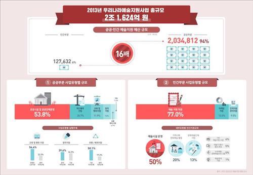 문화예술위 관계자는 "공공과 민간 모두 하드웨어 건립이나 시설 및 단체 운영에 투입된 예산이 전체의 과반을 차지했다"며 "건강한 예술생태계 조성을 위해 창작지원과 교육 및 향유 지원, 복지 지원 등 재원확대가 필요하다"고 지적했다.