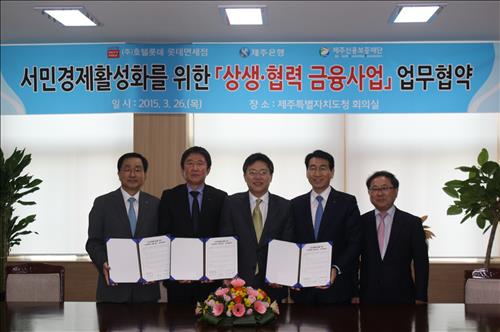 (서울=연합뉴스) 신호경 기자 = 롯데면세점은 26일 제주특별자치도, 제주신용보증재단, 제주은행과 제주 지역 소상공인의 금융 부담을 덜어주기 위한 '상생·협력 금융사업' 업무협약(MOU)을 체결했다.