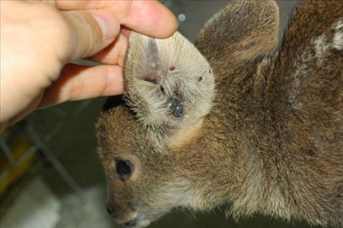 ▲고라니 귀에 붙어있는 작은소피참진드기