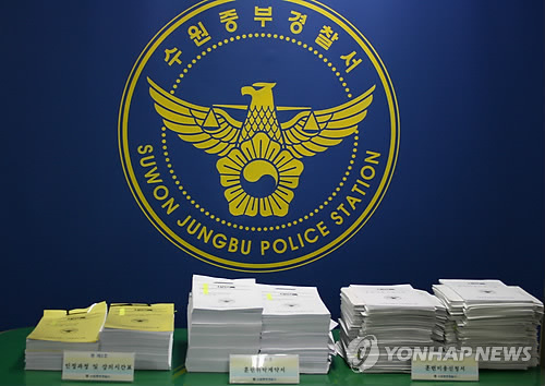 | △ 국가보조금 부정수급 평생교육원·어린이집 원장 검거 (수원=연합뉴스) 경기 수원중부경찰서는 27일 보육교사 7천260명의 위탁훈련과정 출석기록을 조작, 6억원 상당의 국가보조금을 부정 수급한 혐의(특정경제범죄가중처벌법상 사기 등)로 A평생교육원 대표 이모(43)씨를 구속하고, 최모(47·여)씨 등 수원지역 어린이집 원장 151명을 불구속 입건했다. 경찰이 압수한 관련 서류 증거.2015.3.27<<수원중부서 제공>> goals@yna.co.kr |