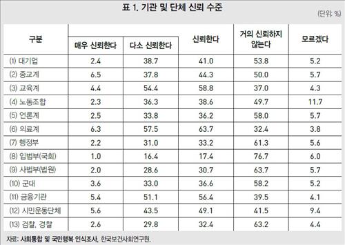 조사 대상 13개 기관·단체 중에서는 입법부에 대한 신뢰도가 가장 낮았고 그 다음으로는 사법부(법원), 행정부, 검찰·경찰, 언론계, 군대, 노동조합 순으로 신뢰도가 낮았다.