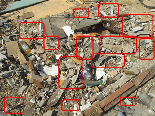 | △ 붉은색으로 표시된 부분이 석면 포함 슬레이트 조각들이다. |