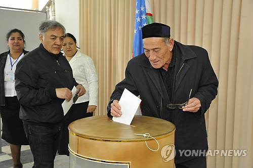 | △ (AP=연합뉴스) 29일 중앙아시아의 우즈베키스탄에서 대선이 치러진 가운데 한 주민이 수도 타슈켄트에 마련된 투표소에서 투표를 하고 있다. 2015.3.29. |