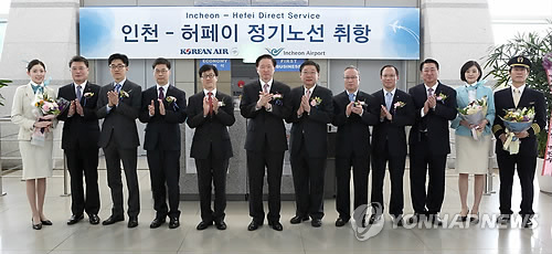 | △ 대한항공 '포청천의 고향' 중국 허페이 취항 (서울=연합뉴스) 30일 오전 인천국제공항에서 열린 '대한항공 인천~허페이 직항 신규노선 취항식'에서 우기홍 여객사업본부장, 박정규 항공기상청장 등 관계자들이 기념 촬영을 하고 있다. (대한항공 제공) |