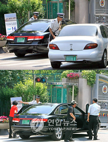 | △ 경찰이 공공기관 승용차 요일제 위반차량의 출입을 제지하자 탑승자들이 차에서 내리고 있다.(연합뉴스 자료사진) |
