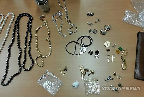 | △ 아파트 털이범이 훔친 귀금속 (전주=연합뉴스) 전북 전주완산경찰서는 30일 전국을 돌며 아파트 현관문을 부수고 금품을 훔친 혐의로 김모씨 등 2명을 구속했다. 사진은 이들이 훔친 귀금속. 2015.3.30 <<전주완산경찰서>> chinakim@yna.co.kr |