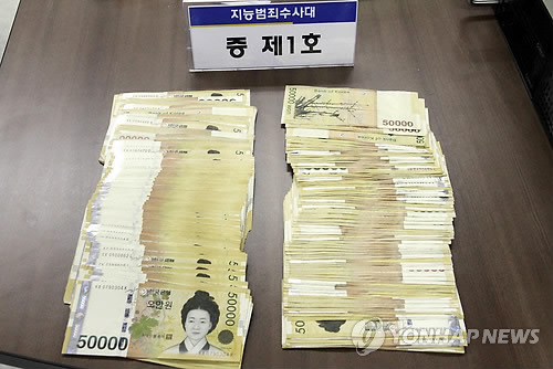 | △ 동업자 살인 청부한 폐유정제업자 덜미 (전주=연합뉴스) 전북지방경찰청 지능범죄수사대는 30일 유통이 금지된 해상 면세유를 불법으로 유통하고, 회사를 가로채기 위해 동업자를 살해하도록 청부한 폐유정제업체 대표 윤모씨를 구속했다. 윤씨는 지난해 9월부터 12월까지 부산항을 통해 해상 면세유 258만t(시가 26억원 상당)을 불법 유통업자로부터 시중보다 30∼40% 싸게 사들여 유통하고, 이 업체의 외국인 노동자를 시켜 동업자 A씨를 살해하려 한 혐의를 받고 있다. 사진은 윤씨가 살인 청부 대가로 지급한 돈. 2015.3.30 <<전북지방경찰청>> chinakim@yna.co.kr |