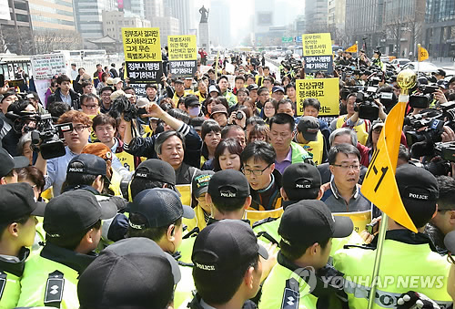 | △ '청와대로' (서울=연합뉴스) 서명곤 기자 = 30일 오후 서울 광화문광장에서 최근 입법예고된 세월호 특별법 시행령안 폐기와 세월호 선체 인양을 촉구하며 농성에 돌입한 세월호 피해 가족과 세월호 참사 국민대책회의 회원들이 항의방문을 위해 청와대로 향하다 경찰에 가로막히고 있다. |